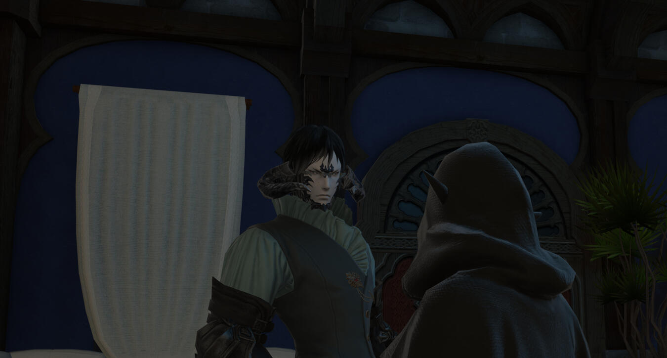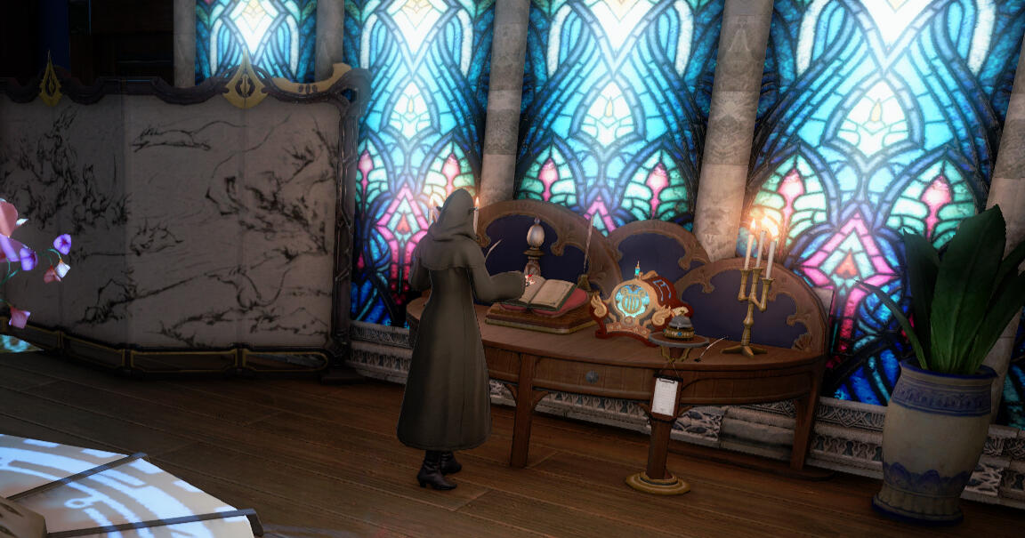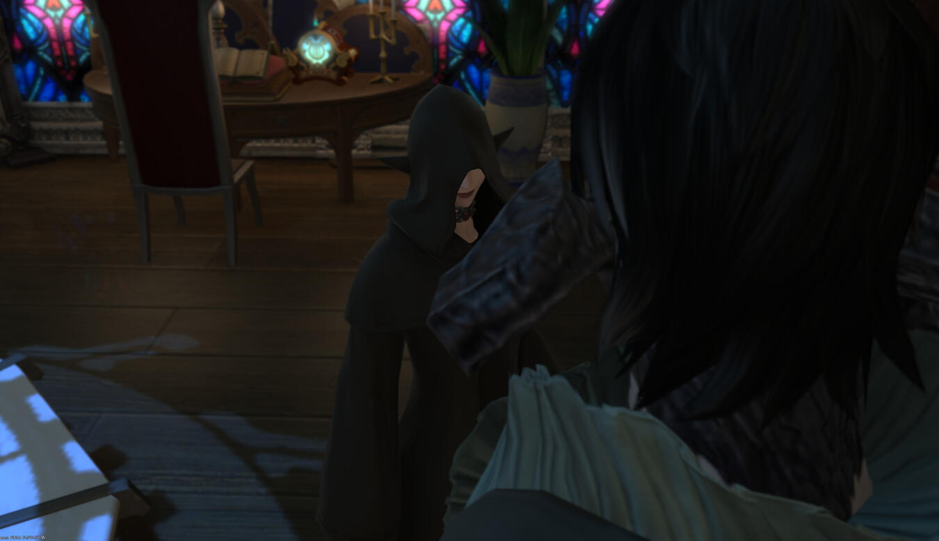A dark-robed figure stood before the unnamed stranger. Her dark, intimidating silhouette contrasts with the bright, beautiful light shining from the blue windows on the farthest wall. From the doorway, one could see the dark-robed figure flipping through various journal pages with her red gloves. She paused when the stranger's voice echoed in the tiny room, closing the journal and not saying a word.